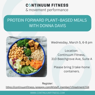 Join Donna Davis for a fun hand’s on worksop where you will help prepare 3 different recipes, learn what plants to focus on for maximum protein, what to eat before and after workout. Recipes will be provided.